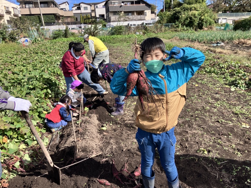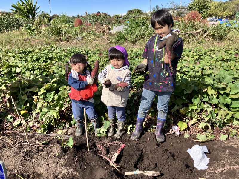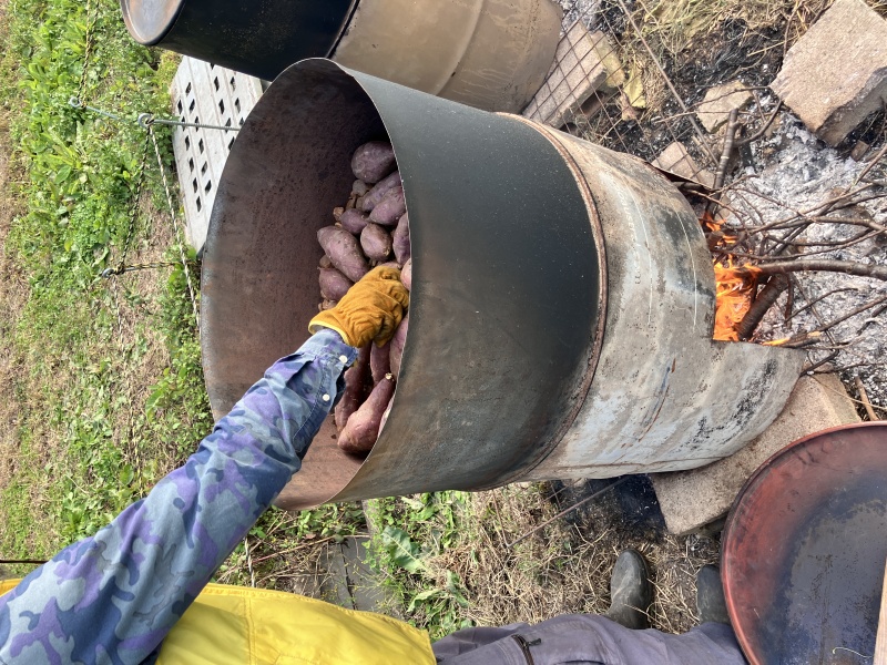 | 爽やかな秋晴れの下、みんなで秋の幸を掘り出しました。本格的な石焼き窯で焼き上げたサツマイモも美味しかった!! |