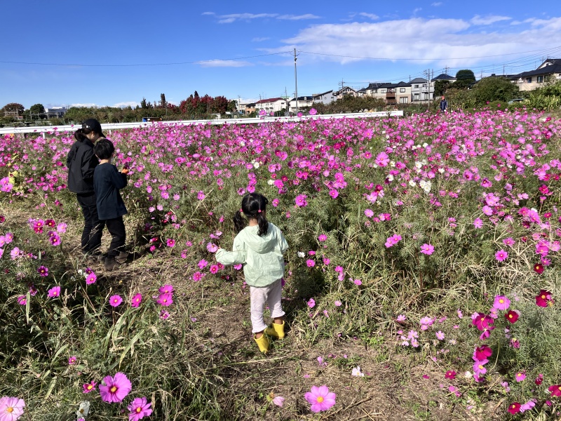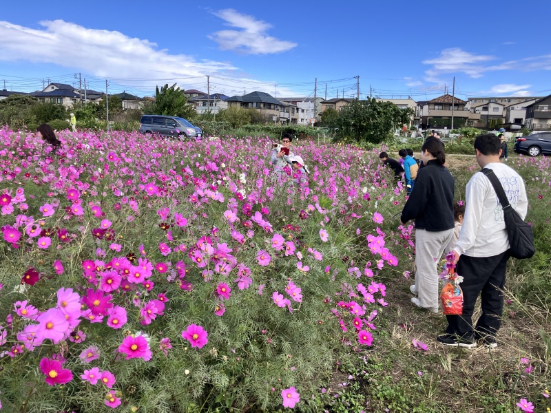 | 晴天に恵まれて、楽しいサツマイモ掘り、焼き芋大会、里芋掘り。おまけに隣接のコスモス畑の鑑賞も楽しみました。 |