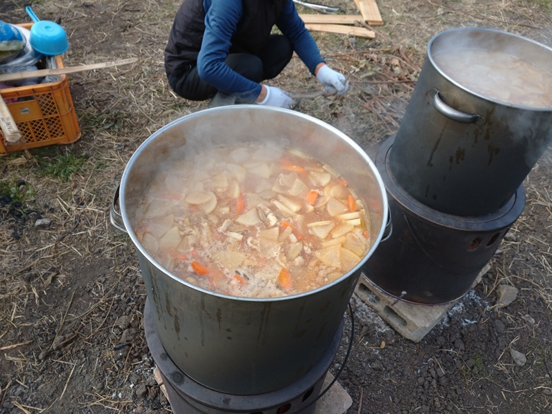その前日は、鍋(ズンドウ)や包丁などの調理器具の洗浄や、畑から掘り出した大根やニンジンや里芋の他に、ゴボウやネギの泥落としをして準備万端整い、当日を迎えました。 |