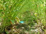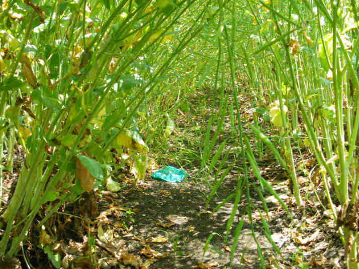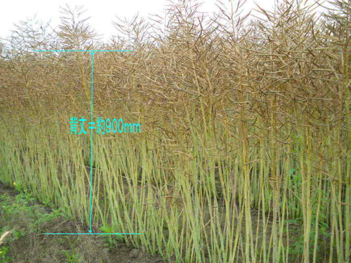 | 慣行畝栽培のナタネ(狭畦栽培の誤記訂正(6/17)) (写真ー1)は埼玉県農林総合研究センターのナタネ畑 @背丈(全高)900mm位で揃ってる。雑草も殆ど無し。 A密生し株の1/3位から枝別れし均一に実を付けてる。 B写真では判らないが、畝間は700mm均等である。 C風倒など無く、綺麗なナタネ畑である。 (写真ー2)は我々のナタネ畑 @根付近より枝別れ、径も不揃い(手蒔、補植は特にバラツキ大) A畑の場所で生育にバラツキ大(地質の均一化・器具播種要す) |