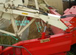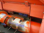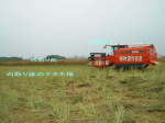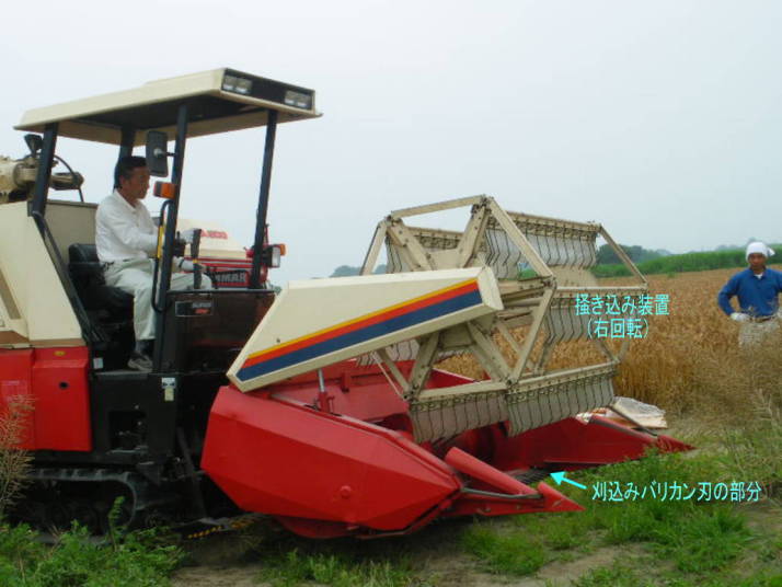 | コンバインの構造ーT (写真ー3)は県所有のヤンマー汎用コンバインの全体仕様(型式は古いとの事) 刈込み開始の状態です。 コンバインの”バリカン”の高さを地面から300mm位の高さにセットし、コンバインが前進すると、ナタネの茎が”バリカン”の刃の間に入る。掻込み装置が回転し、穂先をコンバイン側に抱き込み、”バリカン”の刃で切断されたナタネの穂先がコンバインの中に取り込まれます。 汎用コンバインは、稲に限らず、麦、ナタネ、大豆、ソバ等もコンバインの仕様変更は必要無く、ナタネの刈取りも、本体内蔵のフイルターや選別風量を選択・調整する事で対応可能との事です。 |