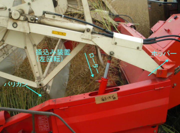 | コンバインの構造ー2 @(写真ー4)はナタネを刈り取る様子です。 ”バリカン”(写真ではハッキリ見えない)で刈取ったナタネの穂先を掻き込み装置で機械側に倒し、ローターの回転で矢印の方向、つまりホッパー側へ運びます。 A(写真ー5)は機械が停止状態のホッパー入口の写真です。 ローターの回転でホッパー入口集められたナタネの穂先が、掻き込み装置の回転でホッパー入口へ押し込まれます。 恐らく、ホッパーの内部は搬送コンベヤーが回転し、コンバイン本体の中に搬入する仕様と考えます。。 |