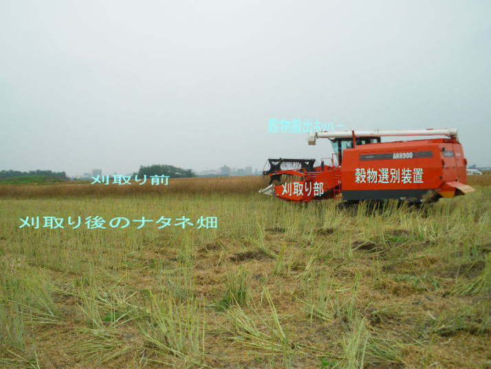| 埼玉県が研究用に栽培しているナタネのコンバイン刈取り作業を見学したのでレポートする 1)日時; 2009年6月10日 AM10時〜AM12時 2)場所; 熊谷市 大字手島 小字古川 3)栽培面積; 約50a 4)使用コンバイン2台(汎用型); ヤンマー(県所有中型) ; クボタ(業者所有の大型) |