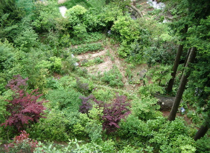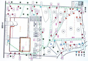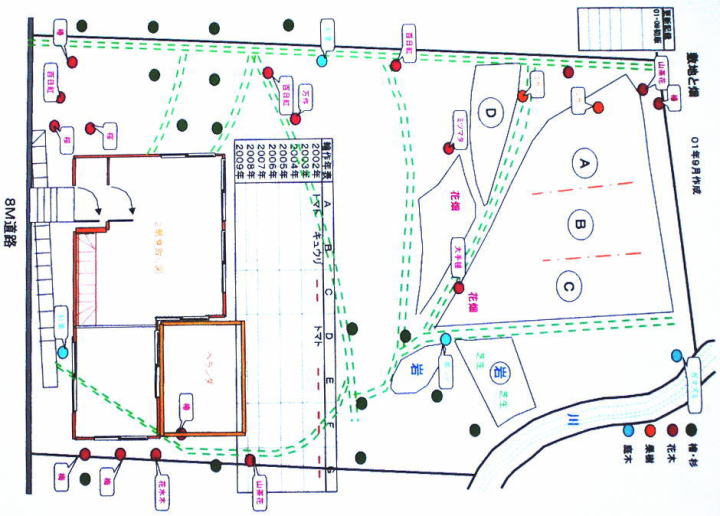 1)右の図面は敷地と樹木と畑の配置の 図面です。 2)表は連作を避ける為、野菜の作付けの 経緯を記録したものです。 3)2年ががりで畑を作り、家内が花や 花木を、私は野菜を植えて来ました。 4)堆肥や肥料を入れ、落葉を腐葉土にし、毎年 ”こんなに注ぎ込んでもダメか”と驚きました。 5)土地は酸性でPH5〜5.5でした。びっくり するほど石灰を入れますが、目標のPH6以上 にはなりませんでした。 ★土地は、右図の右が南で右下がりに傾斜して 図の中央部の小さな畑は傾斜地の段々畑です ★緑の破線は小道です |