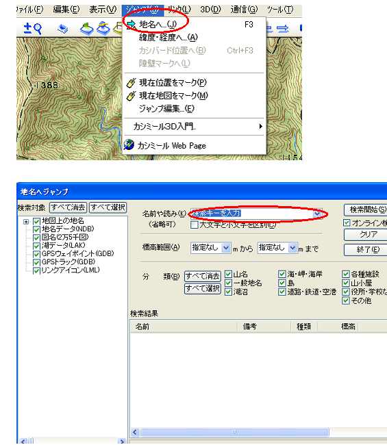 | ・地名入力窓に目的の地名、山の名前等を入力する | |||