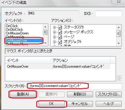 ・「OnMouseOver」を選びスクリプトにスプリクト(R)に